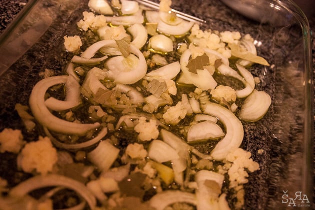 Numa travessa, deitar um pouco de azeite no fundo e juntar a cebola, alho e louro. Juntar depois o bacalhau, os ovos as rodelas e as batatas em pedaços. Regar tudo com azeite e levar ao forno durante 20 minutos.
