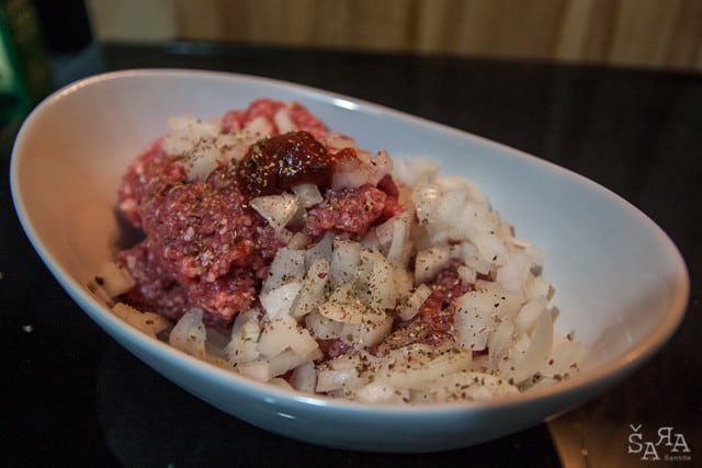 Misturar a carne picada com a cebola picada, uma colher de massa de pimentão, sal e pimenta, até criar uma mistura homogénea.