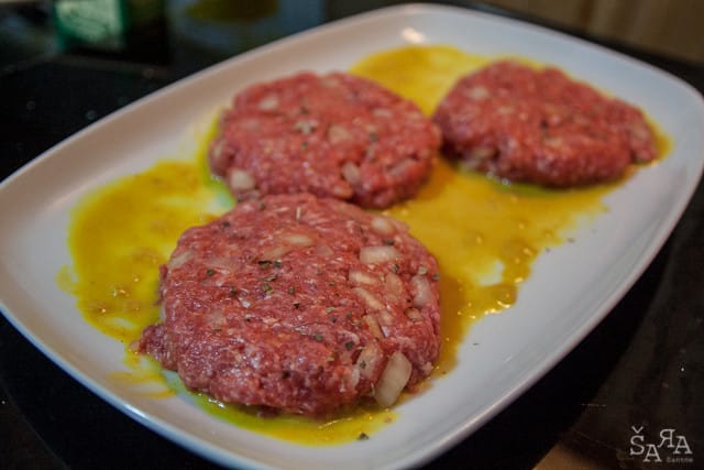 Dividir a carne igualmente e fazer a forma de hamburger e colocar na travessa. Espalhar um pouco de oregãos por cima dos hamburgers.