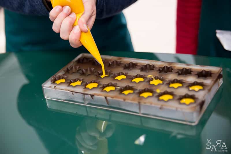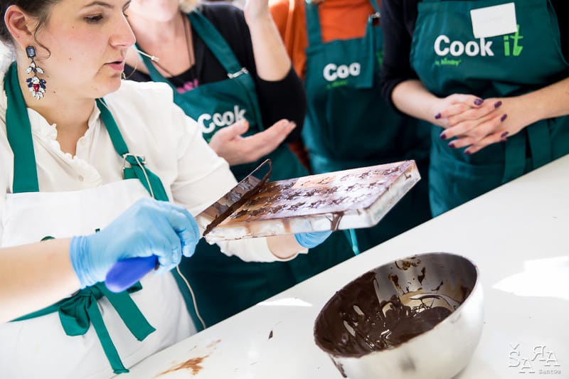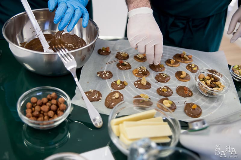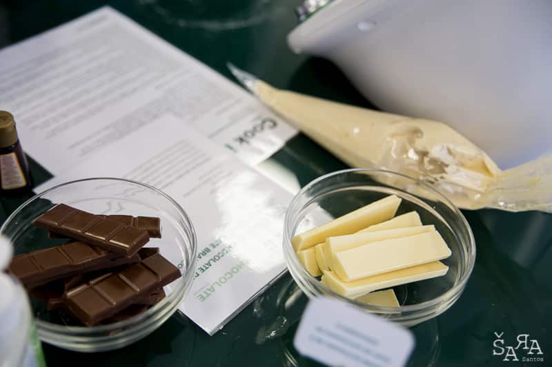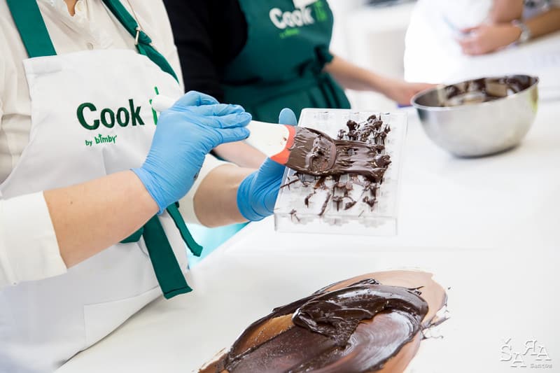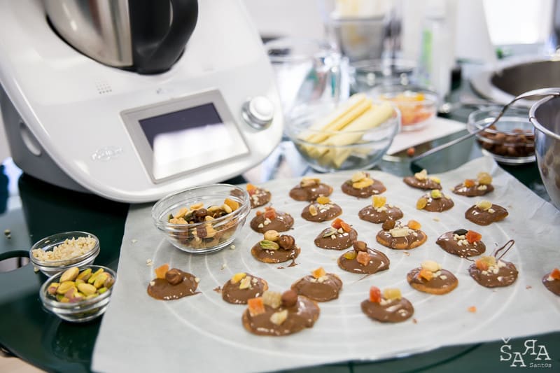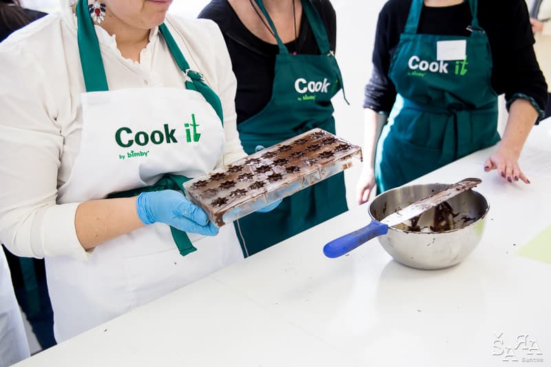 Depois da introdução ao tema em que a formadora explica as bases de trabalhar com chocolate e as bases de funcionamento da bimby (como se fosse preciso) os participantes são divididos pelas diversas ilhas existentes na sala que consistem em mesas de trabalho todas equipadas com uma bimby e os ingredientes necessários para realizar as receitas apresentadas. Fizemos Bombons de ovos moles, Florentinos de chocolate de leite e de chocolate branco, Ovos da Páscoa recheados com mousse de laranja e chocolate branco, Amêndoas caramelizadas cobertas de chocolate negro e Bombons de chocolate negro com ganache de manjericão.