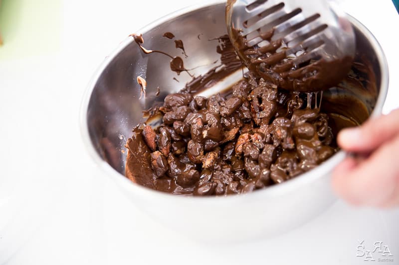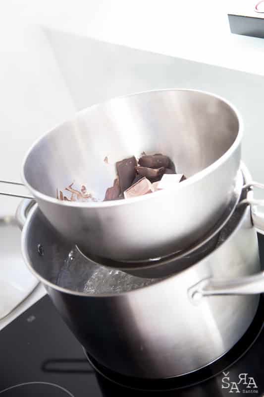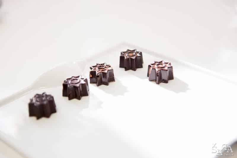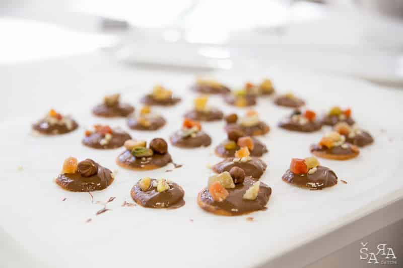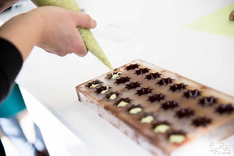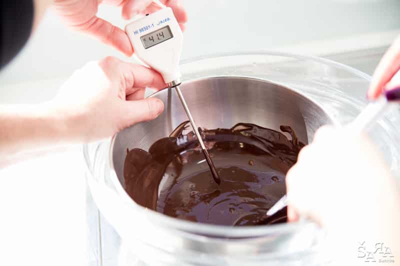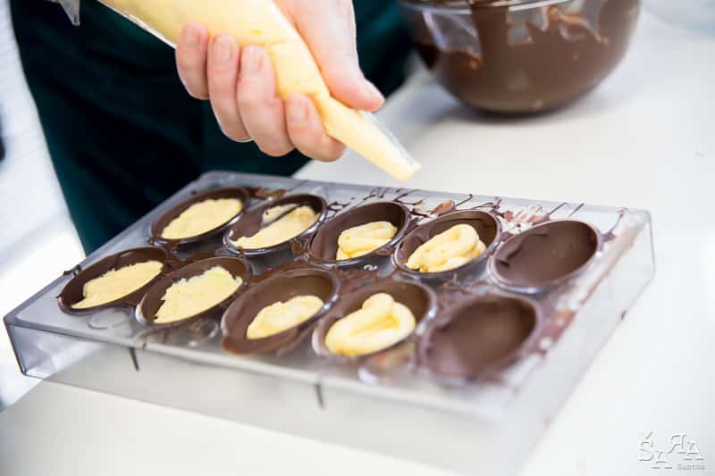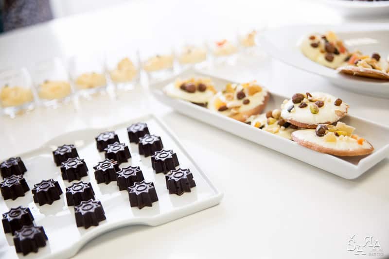 Depois da introdução ao tema em que a formadora explica as bases de trabalhar com chocolate e as bases de funcionamento da bimby (como se fosse preciso) os participantes são divididos pelas diversas ilhas existentes na sala que consistem em mesas de trabalho todas equipadas com uma bimby e os ingredientes necessários para realizar as receitas apresentadas. Fizemos Bombons de ovos moles, Florentinos de chocolate de leite e de chocolate branco, Ovos da Páscoa recheados com mousse de laranja e chocolate branco, Amêndoas caramelizadas cobertas de chocolate negro e Bombons de chocolate negro com ganache de manjericão.